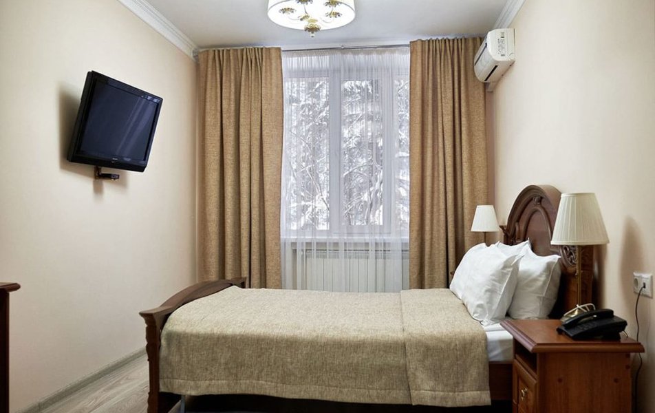 В номере: вешалка, кровать односпальная, прикроватные тумбочки, стол, столик журнальный, стулья, шкаф, сейф, телевизор ЖК, телефон, холодильник, чайный набор посуды, электрочайник