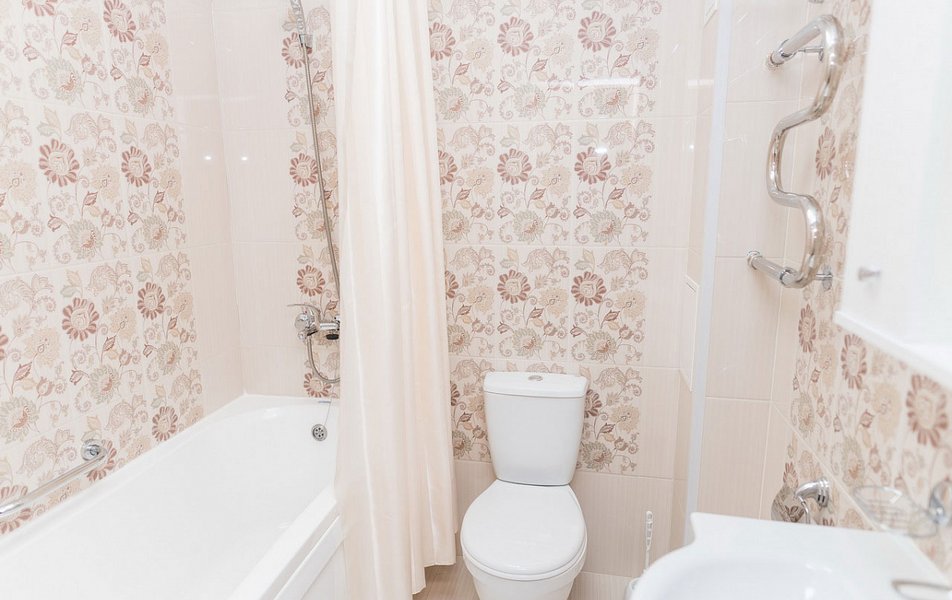 Санузел: ванна, раковина, унитаз, тапочки, туалетные принадлежности, фен, халат