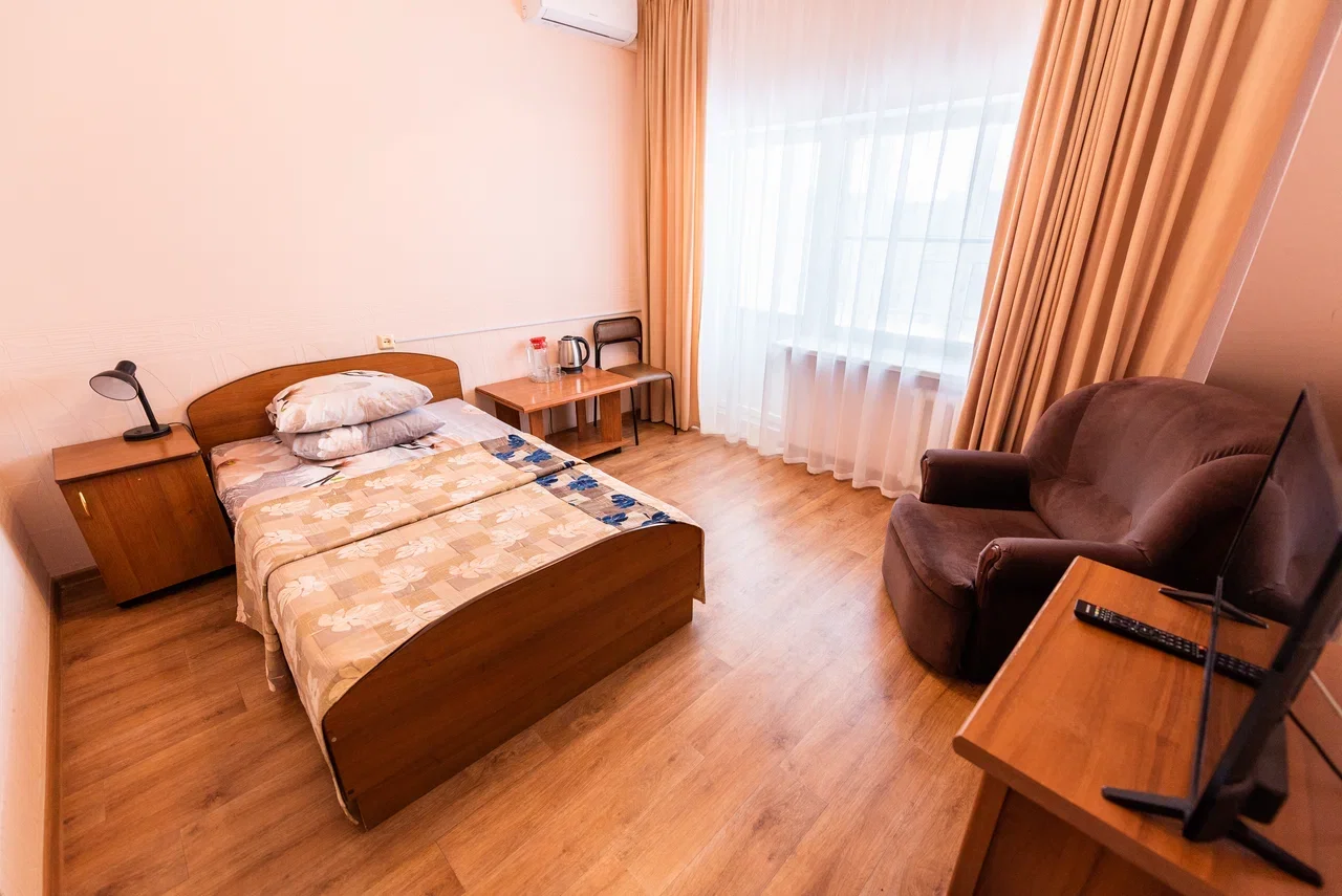 Оснащение номера: двуспальная кровать, прикроватная тумбочка, стол, стулья, шкаф, кресло, телевизор, холодильник, чайный набор посуды, электрочайник