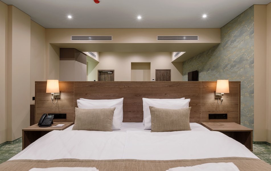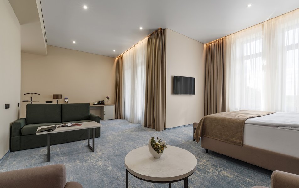 В номере: вешалка, диван, зеркало, кресло, кровать двуспальная, прикроватные тумбочки, стол, шкаф, мини-холодильник, сейф, телевизор ЖК, телефон, чайный набор посуды, электрочайник