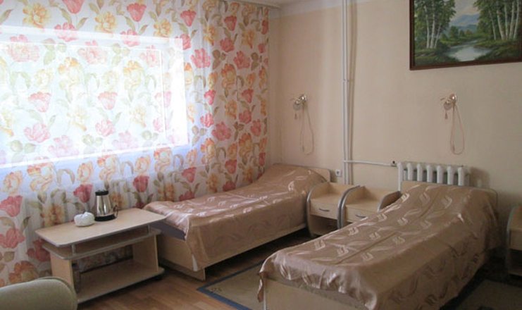 В номере: зеркало, кресло, кровати односпальные, прикроватные тумбочки, стол, стулья, шкаф, мини-холодильник: на блок, телевизор, чайный набор посуды, электрочайник