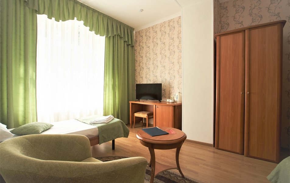 В номере: вешалка, зеркало, кресло, кровати односпальные /одна двуспальная кровать, прикроватные тумбочки, стол, столик журнальный, шкаф, телевизор, телефон, холодильник, чайный набор посуды, электрочайник