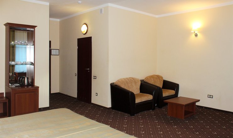 В номере: две удобные отдельные кровати, две тумбочки, кресло-кровать, журнальный столик,два стула и сьменный стол, настольная лампа, шкаф с зеркалом, ЖК телевизор, телефон, стеллаж, мини-бар, электрический чайник, набор посуды,сейф, бесплатный wi-fi, кондиционер
